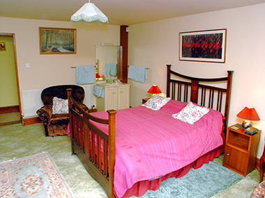 This is a bedroom with double bed, wash hand basin, tea/coffee making